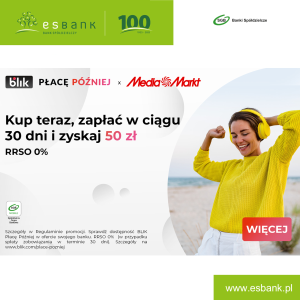 - Korzystając z promocji ”Kup teraz, zapłać mniej z BLIKIEM Płacę Później dla Klientów Media Markt” zyskasz 50 zł.