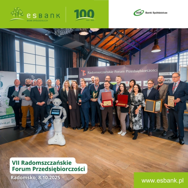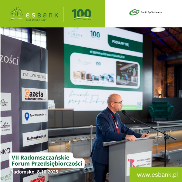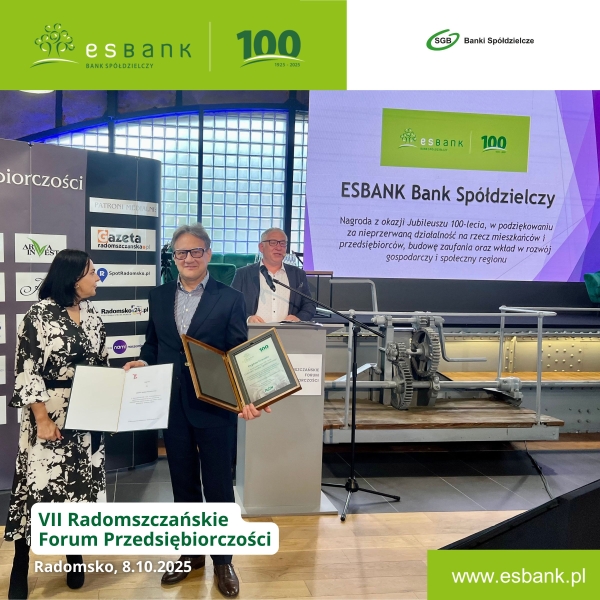 „Dyplom Uznania z okazji jubileuszu 100-lecia, w podziękowaniu za nieprzerwaną działalność na rzecz mieszkańców i przedsiębiorców, budowę zaufania i wkład w gospodarczy i społeczny rozwój regionu”. Takie wyróżnienie w imieniu radomszczańskich przedsiębiorców na ręce Wiceprezesa Zarządu ESBANKU, Pawła Braszczyńskiego, przekazała prezes Rady RIP-H w Radomsku, Dorota Krajewska-Trajdos, podczas VII Radomszczańskiego Forum Przedsiębiorczości, które odbyło się 8 października 2025 r. w Radomsku.