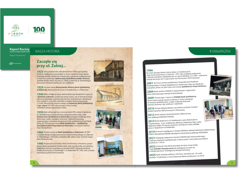 Więcej na temat 100 lat tradycji, misji oraz konsekwentnej drogi od lokalnego, Mieszczańsko-Rolniczego Banku Spółdzielczego, który powstał w 1925 roku w Radomsku, do uniwersalnej instytucji finansowej dla każdego, która specjalizuje się w finansowaniu firm z sektora MŚP, posiada stabilną pozycję na lokalnym rynku oraz należy do grona liderów w Grupie SGB – w jubileuszowym Raporcie Rocznym ESBANKU. ZOBACZ TUTAJ